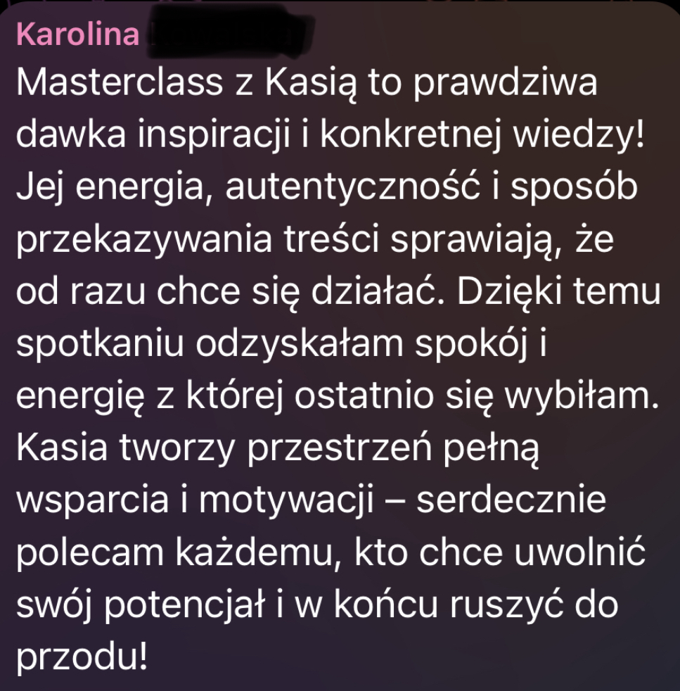 ✅ Dostęp do nagrania Masterclassu – możesz wracać do treści zawsze, gdy potrzebujesz przypomnienia swojej mocy