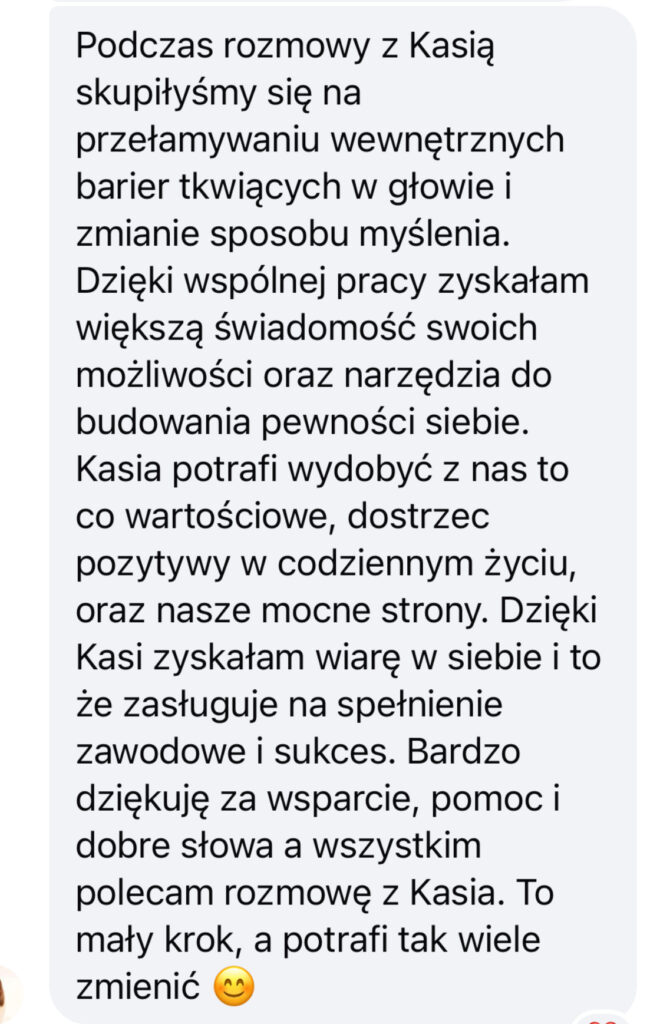 - Przeprogramujesz minimum 3 przekonania, które blokują Twój rozwój – np. „jestem za stara”, „poza etatem nie dam rady”, „muszę mieć pewność, zanim zacznę”. W ich miejsce stworzysz wspierające myśli, które realnie zmienią Twoje działania